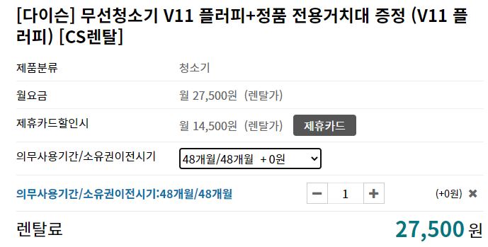 다이슨 청소기 월 렌탈료는 월 27,500원이예요~