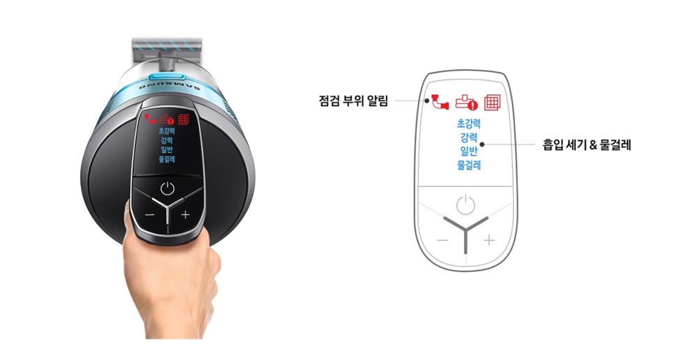 청소기 흡입 세기를 눈으로 확인하고 파워 조작도 엄지손가락으로